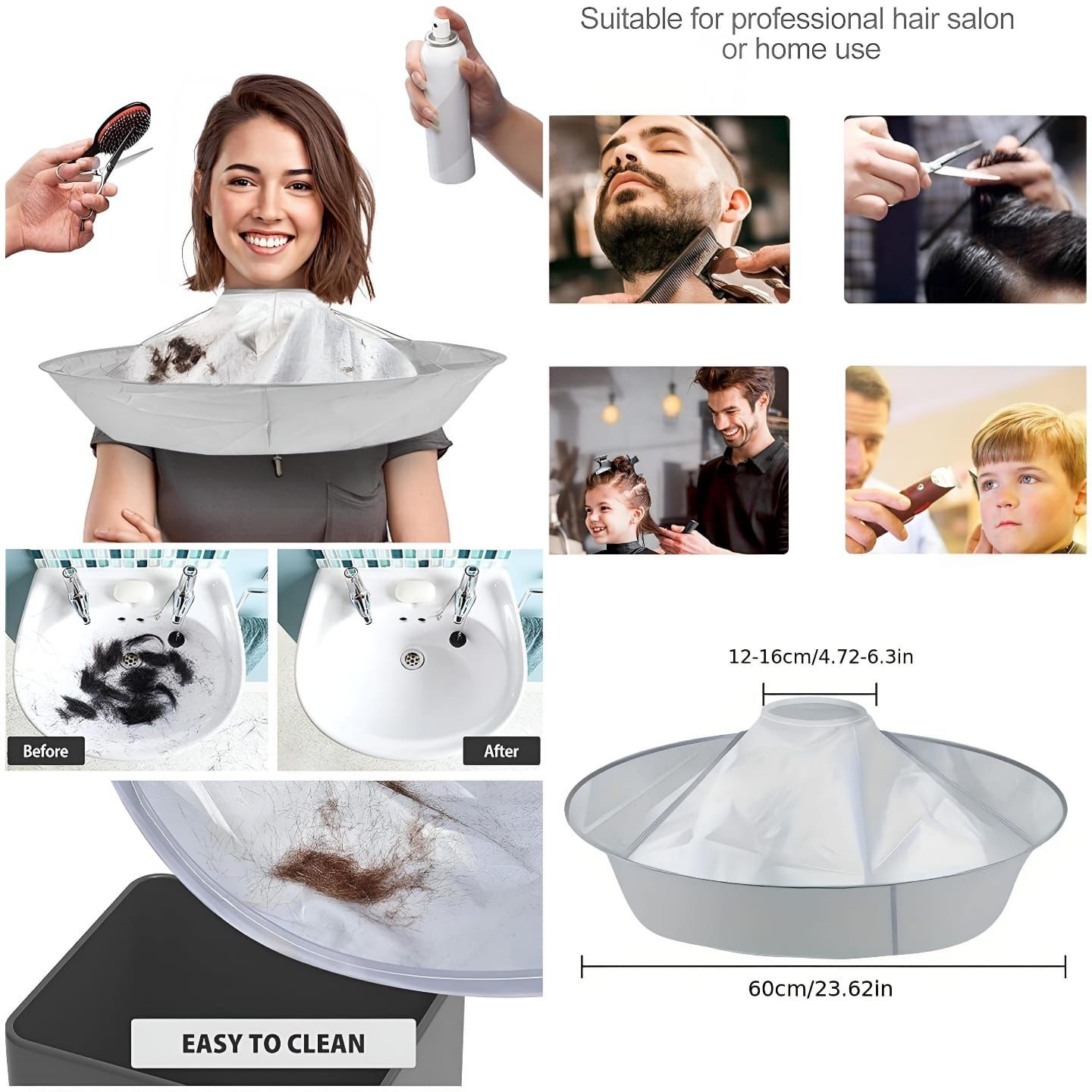 Designed to catch hair clippings during haircuts, preventing them from falling onto clothing or the floor. Made of waterproof material that allows easy and trouble-free cleaning. Adjustable velcro neck closure. Foldable. Suitable for professional hairdressers or for family haircuts, suitable for men, women and children.